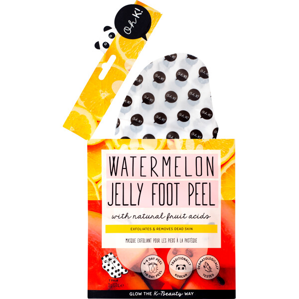 Oh K! Watermelon Jelly Foot Peel är en exfolierande fotmask som innehåller fruktsyror (AHAs & BHAs) som varsamt exfolierar huden och tar bort döda hudceller.
