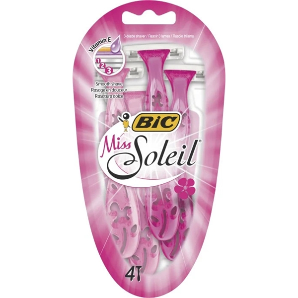 BIC Miss Soleil Razor är en rakhyvel med 3 blad som ger en nära rakning. Miss Soleil-hyveln har en mjukgörande remsa med vitamin E för att vara extra snäll för huden vid rakning.Hyveln har ett ergonomiskt handtag med en blommönsteringjutet i handtaget.