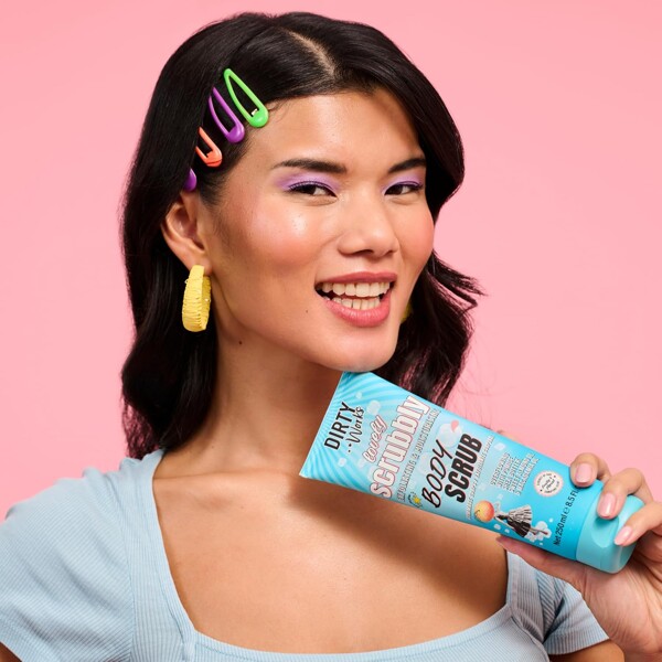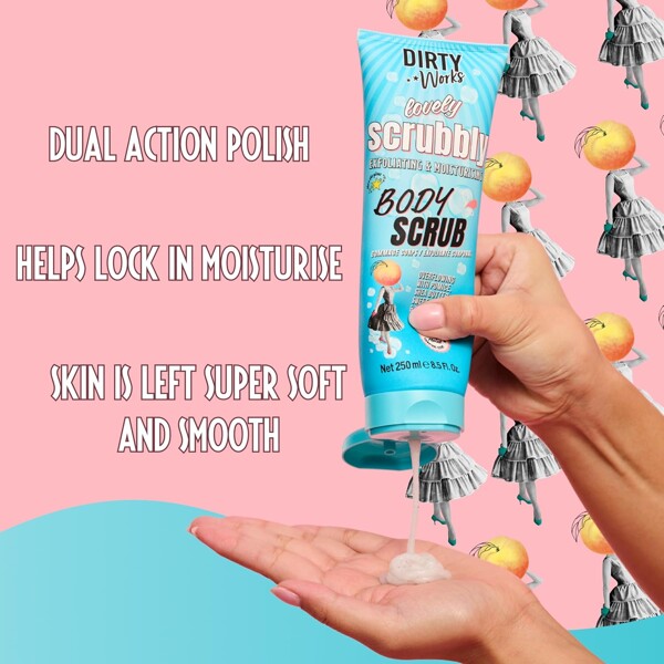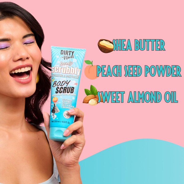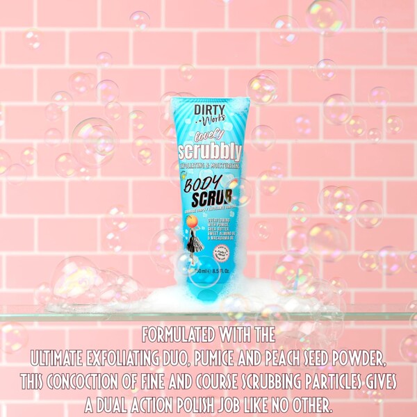 Ta farväl av torr, tråkig flagnande hud och upptäck ett mjukare, förnyat själv från topp till tå med Dirty Works Lovely Scrubbly Body Scrub. Innehåller exfolierande pimpsten och krossade persikokärnor, fuktgivande sheasmörolja, mjukgörande E-vitamin samt en exotisk doft av eteriska oljor från solvända, neroli och jasmin.