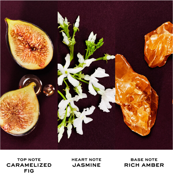 Doften öppnar med ett saftigt ackord av karamelliserat fikon, som möter ett hjärta av blommande jasmin absolut. Basen vilar på ett varmt amberackord som ger doften dess fylliga djup och långvariga intensitet.