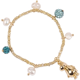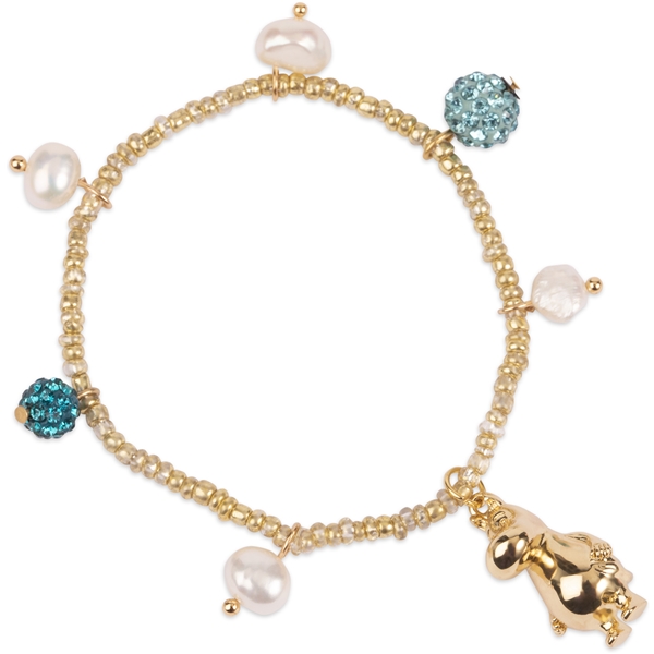 Ett handpärlat elastiskt barnarmband med guldiga glaspärlor, två turkosa hängande glitterbollar och vita äkta sötvattenspärlor. Mitt fram hänger en guldpläterad Mumin-berlock som är 21 mm hög.