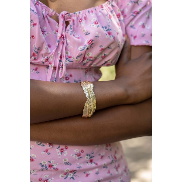 Armbandet är guldpläterat och mäter som bredast 7 cm.