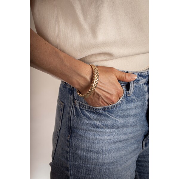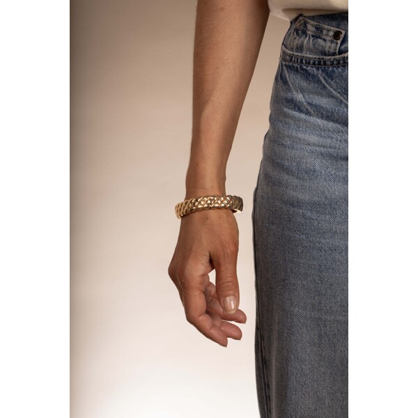 Ett elastiskt armband i metall med guldplätering. Armbandet har ett fint mönster som känns lyxigt och modernt.