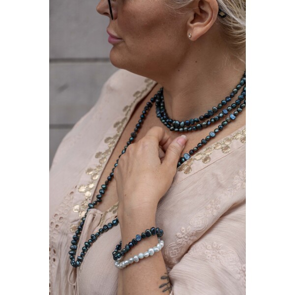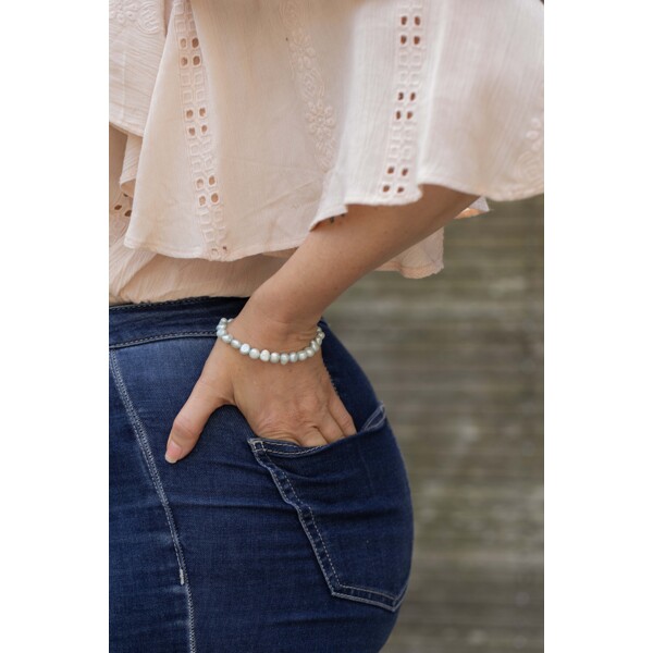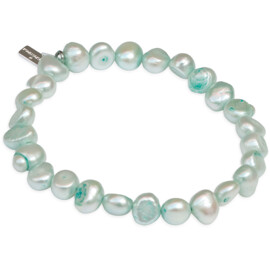 Ett ljusturkost elastiskt pärlarmband med äkta sötvattenspärlor. Eftersom pärlorna är infärgade i turkost så finns lite fläckar på pärlorna med extra turkost där pärlorna är ojämna i ytan.