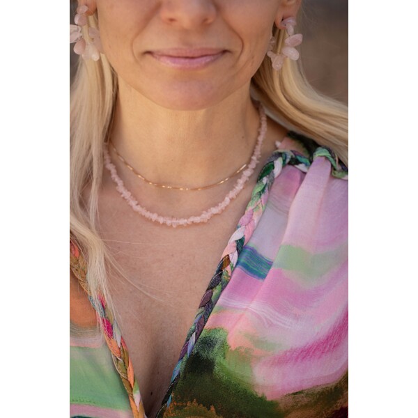 Ett coolt halsband med rosa små rosenkvartsstenar.