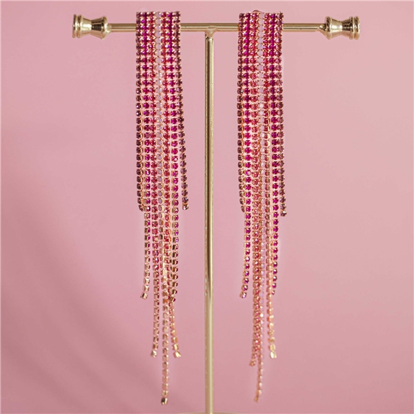 88117-01 BLUSH Shade Earring är ett par långa roséguldpläterade örhängen med rosa glaskristaller i olika längder. Örhängena reflekterar ljuset på ett vackert sätt och de rör sig vackert. Örhänget är 13,5 cm långt och 1,4 cm brett på det bredaste stället. Stiften är i kirurgiskt stål och de är nickelsäkra.