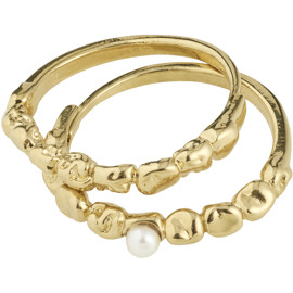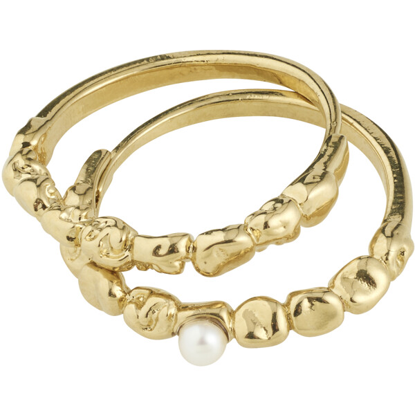 Det guldpläterade SHIFT-ringsetet från Pilgrim är skapat för dig som älskar en stacked look med en touch av romantisk elegans. De två ringarna har en organisk form med glänsande finish, där den ena har en liten pärlemorsfärgad glaspärla som tillför en drömlik touch.
